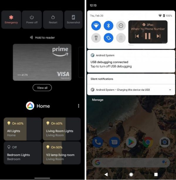 In termini di novità legate ai Controlli, Google evidenzia la tendina dei quick settings in cui trovano spazio i controlli multimediali e il nuovo menu di accensione arricchito non solo delle carte di Google Pay ma anche di un menu della domotica grazie al quale avere sottomano le icone di tutti i dispositivi (per adesso il tutto si basa sull’app Google Home ma non escludiamo che ogni produttore possa personalizzare questa schermata con il proprio ecosistema).