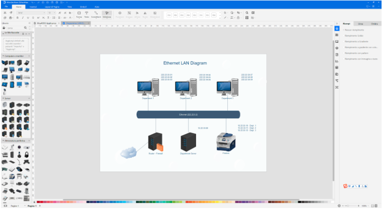 Il primo passo da fare successivo all’installazione e all’avvio del programma è quello di scegliere quali saranno le icone che rappresenteranno i differenti elementi della rete. I principali sono sicuramente i computer ed altri dispositivi e terminali, con i relativi connettori “intelligenti”. I progetti realizzati con EdrawMax saranno quindi dettagliati ed accurati, ma soprattutto facili da mettere in atto.
