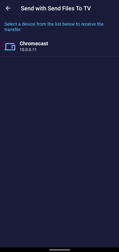 Aprire l’app “Send files to TV” e approvare la sua richiesta di autorizzazione per accedere a file multimediali e file. Toccare il grande pulsante Invia e trovare l’APK che è stato scaricato (probabilmente si troverà nella cartella Download). Selezionandolo si apre un elenco di dispositivi destinatari che dovrebbe includere anche la Chromecast. Ovviamente, sia il telefono che la Chromecast devono essere collegati alla stessa rete perché funzioni.