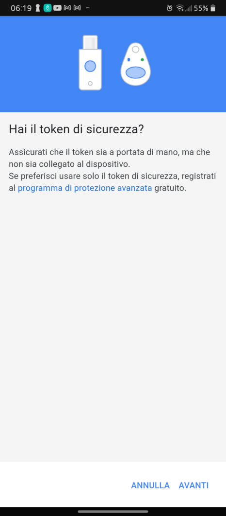 - Assicurarsi di avere il token a portata di mano ma non inserito nello smartphone. Tappare su “Avanti” e, alla richiesta, inserire il token (se necessario toccare il tasto presente sulle Yubikey che si assicura che non sia un bot che sta registrando il token)