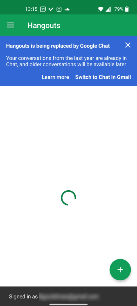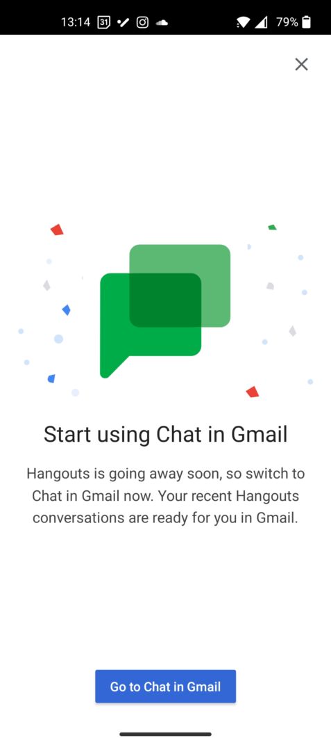 Gli utenti consumer che provano a usare le app Android o iOS di Google Hangouts vengono accolti da un banner blu che spiega che il servizio non durerà a lungo. Il banner invita gli utenti a “Passare alla chat in Gmail” e, se si preme quel banner, si verrà disconnessi da Hangouts con quell’account e indirizzati alla sezione Chat in Gmail.