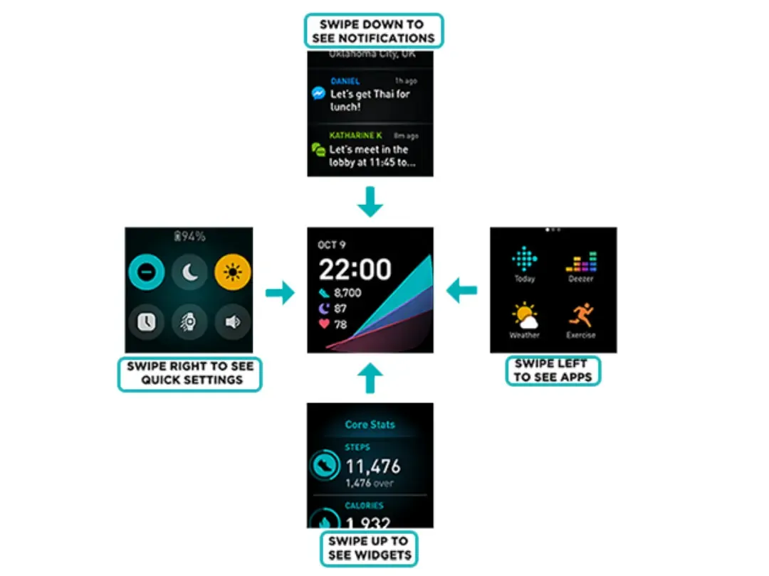 Scorrendo verso il basso nella schermata iniziale si aprono le impostazioni rapide mentre scorri verso l’alto per visualizzare le notifiche. Scorrendo verso sinistra o verso destra nella schermata iniziale vengono visualizzati i riquadri per il conteggio dei passi giornalieri, la frequenza cardiaca, la valutazione del sonno e i dati meteorologici. Puoi anche iniziare un esercizio su una di queste tessere.