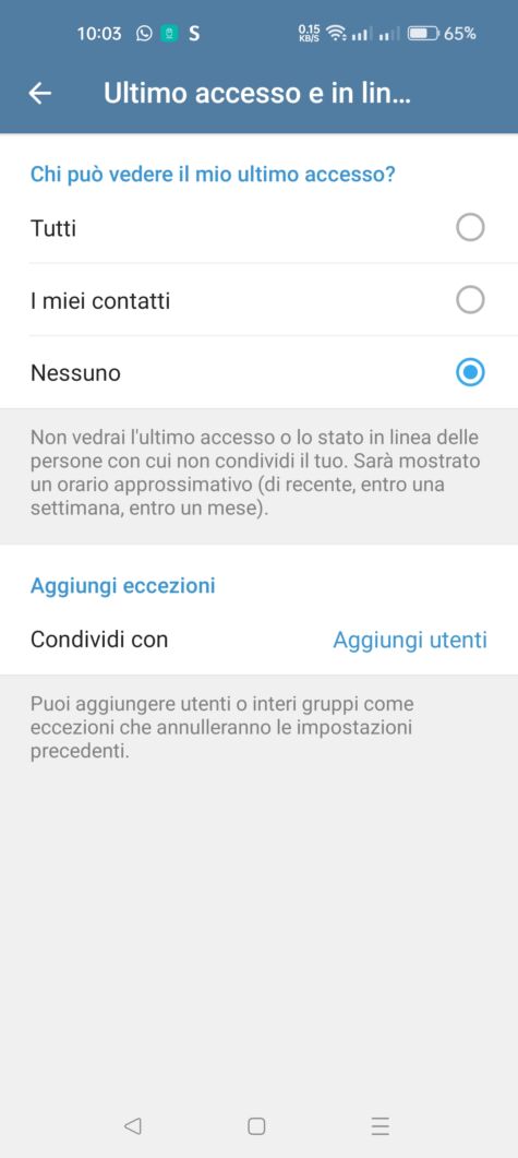 Ricorda che, nel caso in cui disattivi la funzione “Ultimo accesso”, non potrai nemmeno vedere la stessa informazione delle altre persone (il sistema di privacy funziona in entrambe le direzioni). Potrai, in compenso, visualizzare un valore approssimativo. Questo tiene lontano gli stalker, ma permette di capire se l’altra persona è raggiungibile su Telegram.