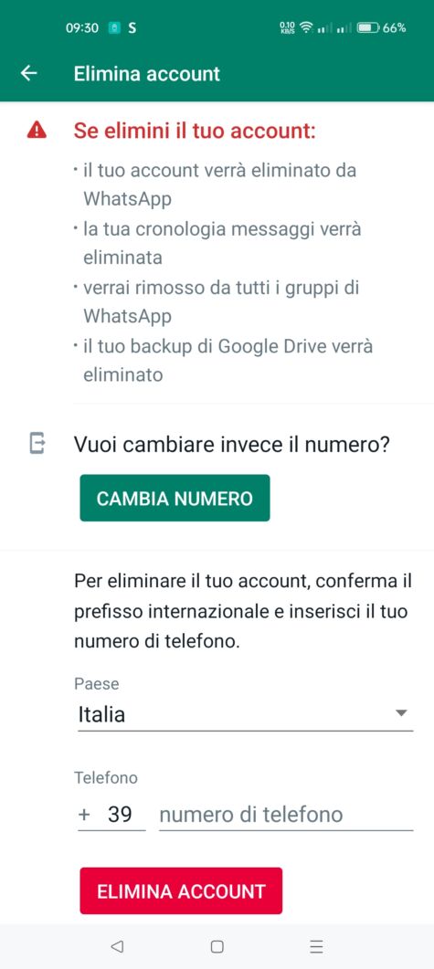 • inserisci il tuo numero di telefono nel formato internazionale completo e tocca ELIMINA ACCOUNT