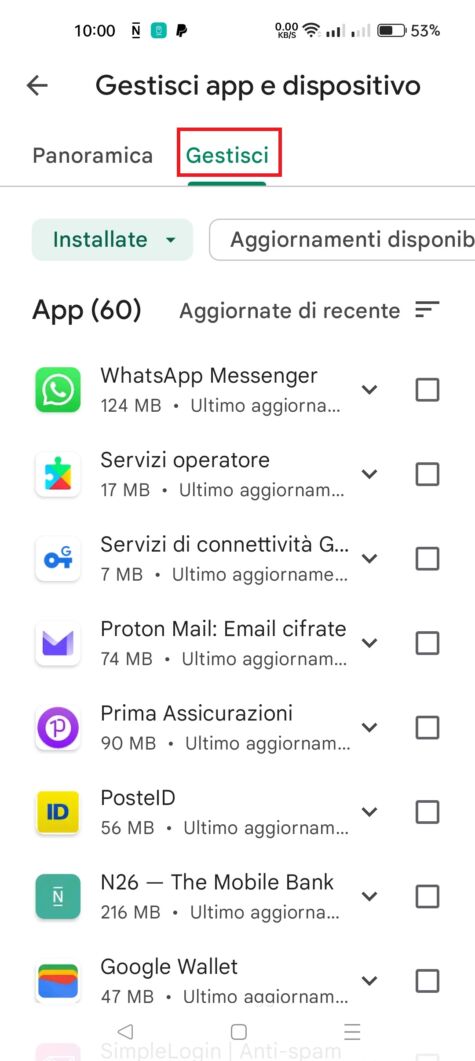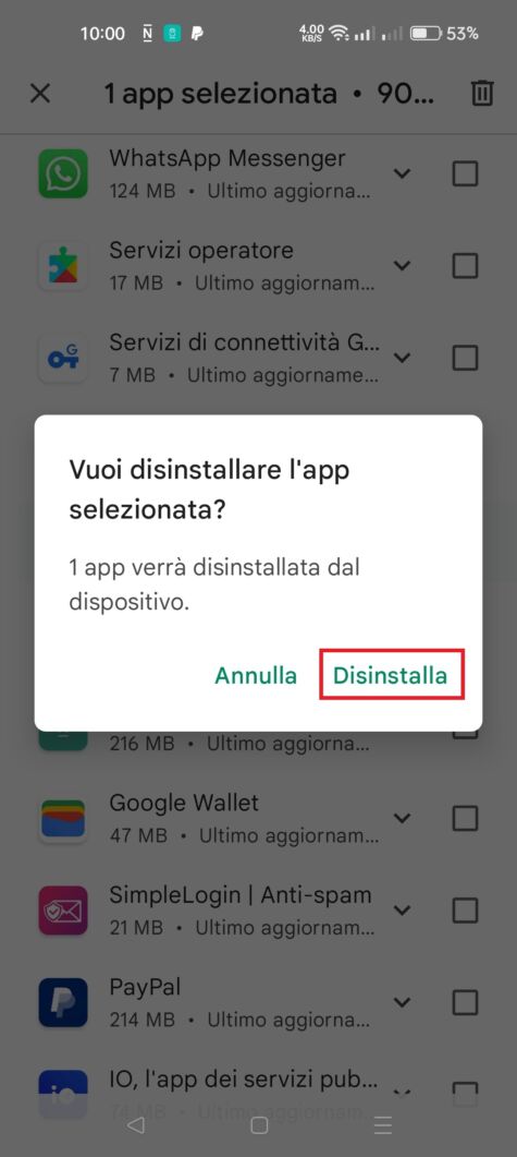 • Selezionare le app che si vogliono disinstallare e poi toccare sull’icona del cestino in alto a destra