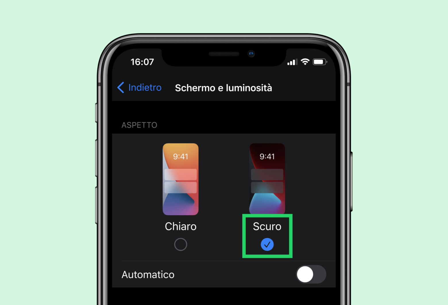 - Scuro: per attivare la modalità scuraSeleziona una delle opzioni seguenti alla voce ASPETTO: