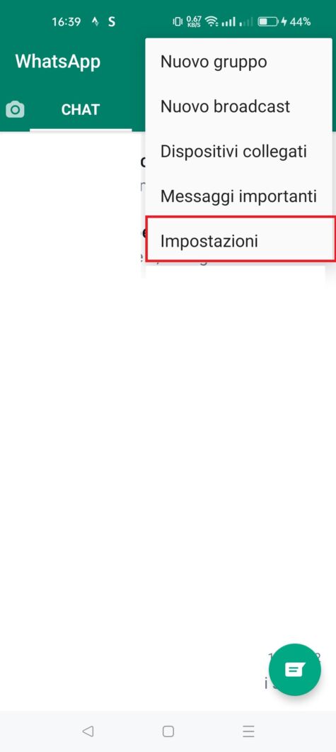 - Aprire WhatsApp e recarsi nelle Impostazioni generali (toccare i tre puntini messi in colonna in alto a destra e poi Impostazioni)