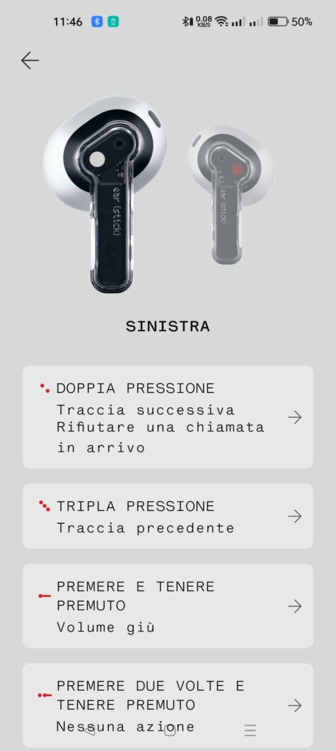 - Singola pressione prolungata, doppia e tripla pressione (singola o prolungata) sono personalizzabili nell’applicazione Nothing X