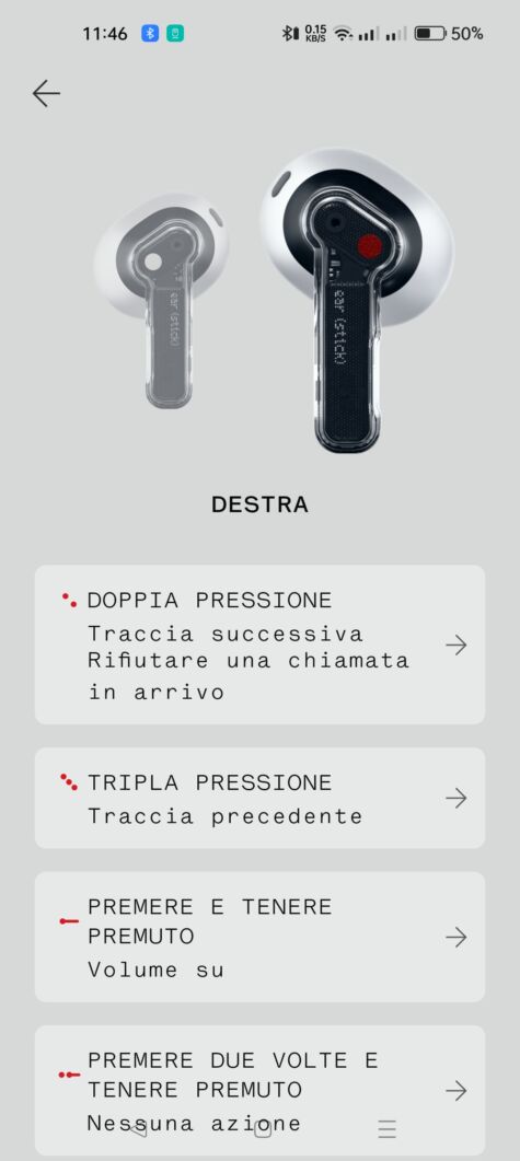 • Singola pressione prolungata, doppia e tripla pressione (singola o prolungata) sono personalizzabili nell’applicazione Nothing X