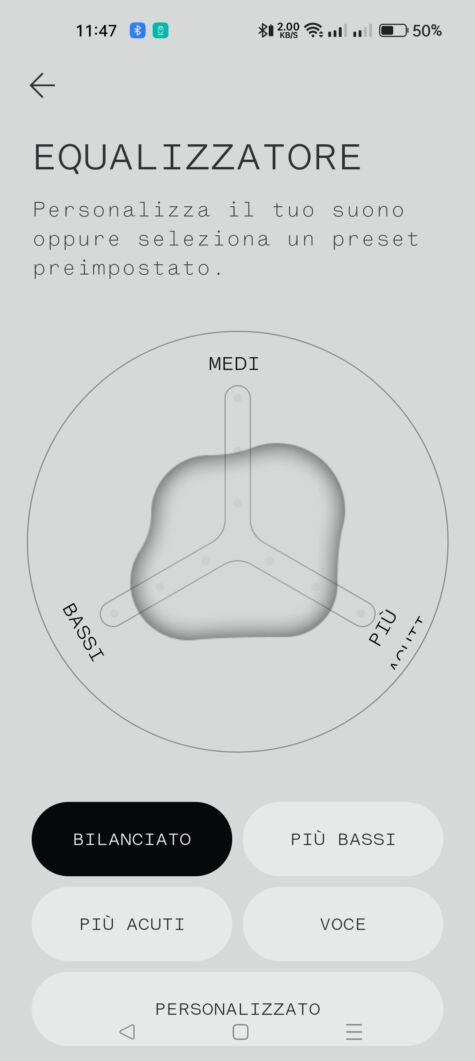 Dopo il primo abbinamento, è possibile utilizzare l’applicazione Nothing X per personalizzare un basilare equalizzatore del suono, così come le azioni da eseguire con una doppia e tripla pressione sullo stelo di ogni auricolare.