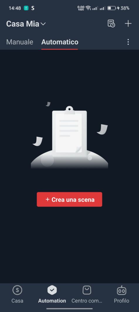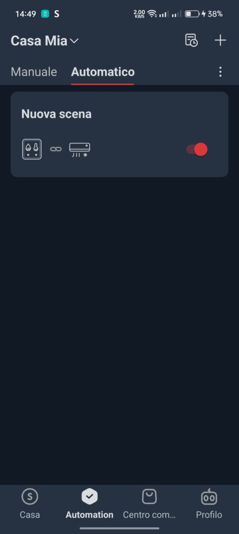 Dalla home page dell’app, basta che ti rechi nel menu “Automation” dal menu in basso e poi selezioni “Automatico”. Da lì puoi iniziare a creare le tue automazioni basate sui sensori dell’Hub 2.