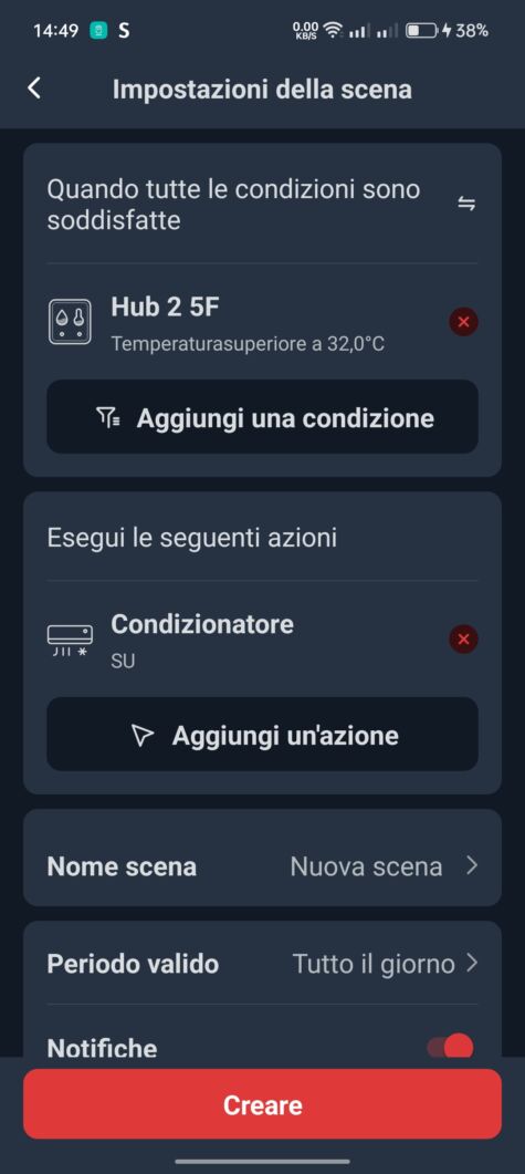 Per fare ciò, ho dovuto inizialmente “addestrare” lo Hub v2 a interagire col condizionatore e successivamente sfruttare i dati dei sensori per fargli fare un’azione preimpostata (nell’app chiamata Scena).