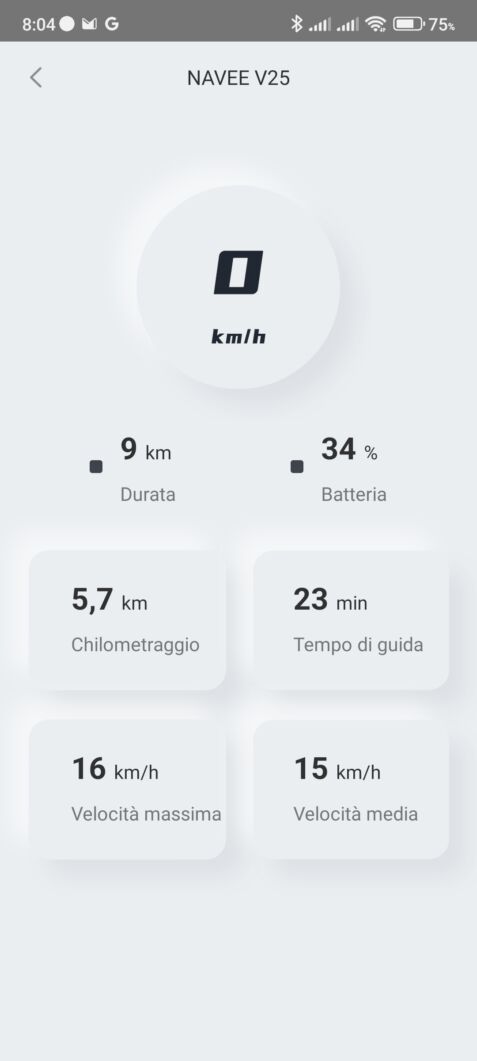 La schermata principale mostra l’autonomia stimata del monopattino insieme ad alcune icone che permettono di gestire: