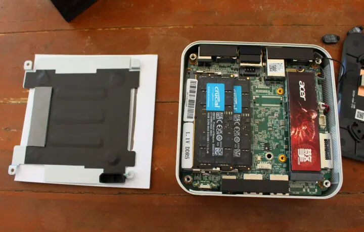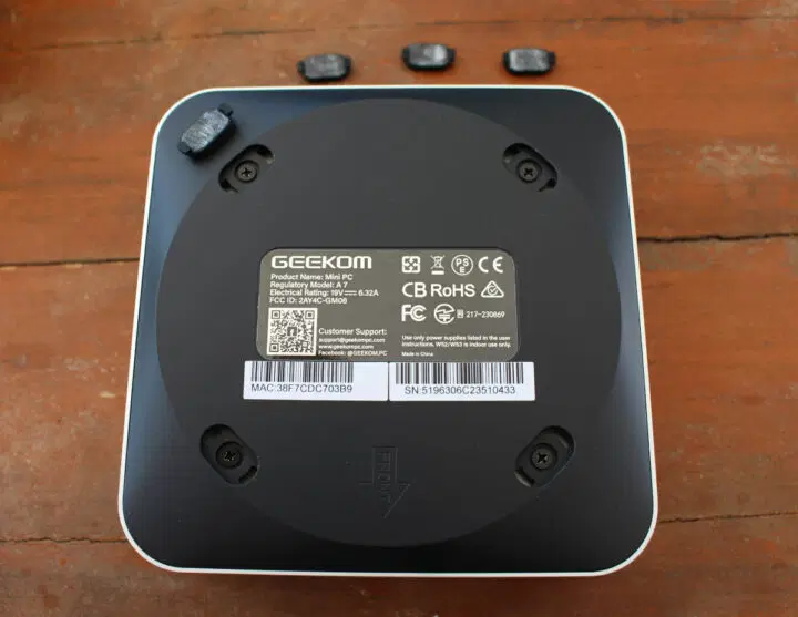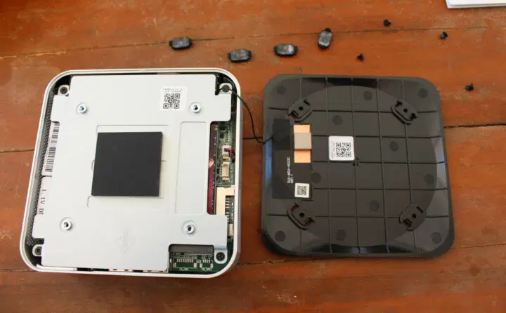 A proposito di memorie, per accedere all’interno del mini PC e procedere eventualmente a sotituirle (o ad aggiungere un ulteriuore SSD M.2) è possibile rimuovere i piedini inferiori ad incastro e svitare le quattro viti. Questo dà accesso al vano interno ma vi è ancora una lastra in metallo da rimuovere (probabilmente posta lì come aiuto alla dissipazione) con ulteriori 4 viti prima di poter avere accesso alle memorie.