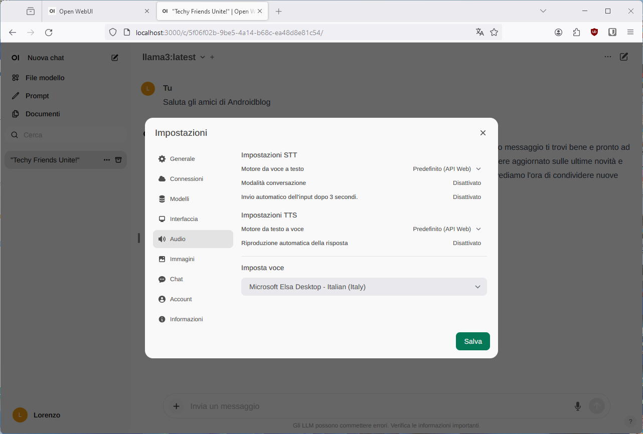 Dalle impostazioni è possibile modificare alcuni parametri, come ad esempio la lingua dell’interfaccia grafica e il modello di sintesi vocale da usare per leggere le risposte del chatbot AI.