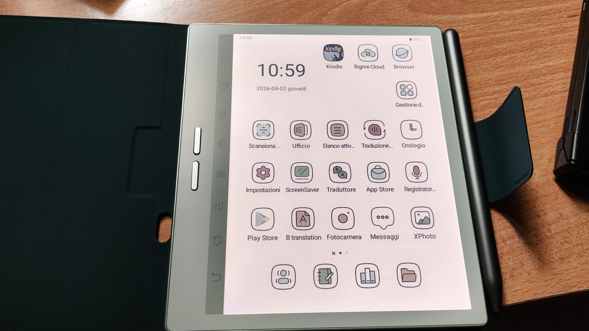 L’hardware contribuisce a rafforzare questa doppia identità. Il processore MediaTek Dimensity 1080, gli 8 GB di RAM e i 256 GB di memoria lo rendono molto più potente della media degli e-reader, permettendo un multitasking fluido e un utilizzo simile a quello di uno smartphone o tablet compatto. Non a caso, sotto il profilo tecnico, ricorda da vicino lo smartphone Bigme Hibreak Pro Color, con cui condivide filosofia e impostazione generale.